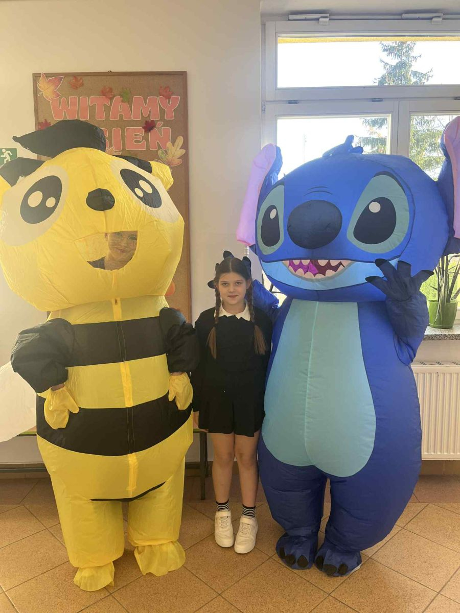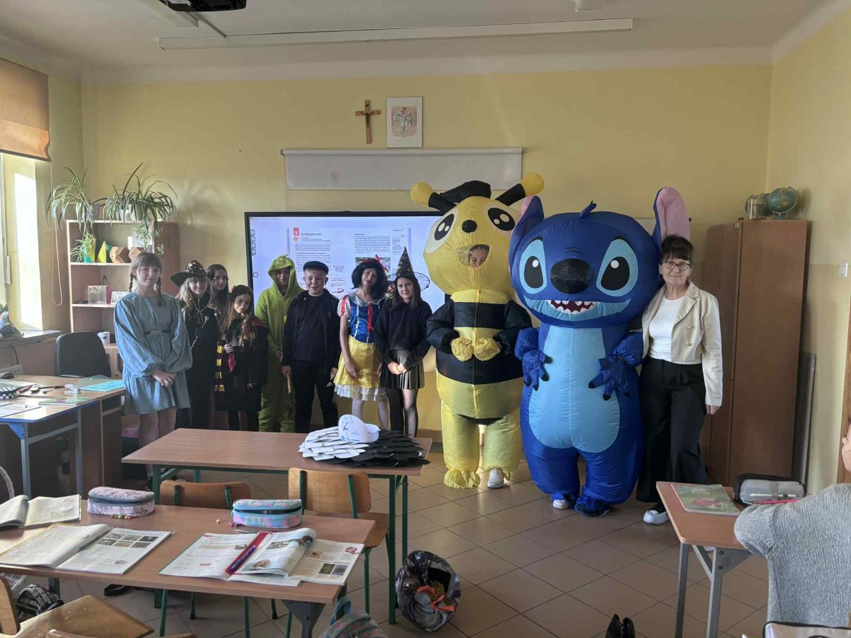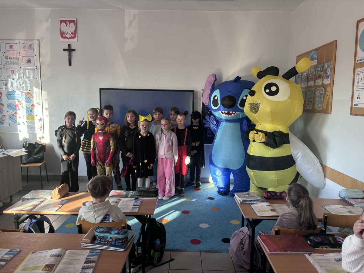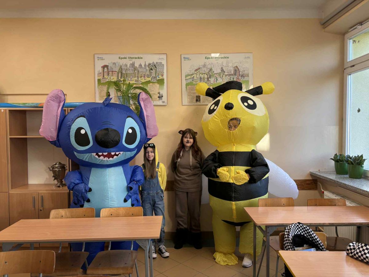 Niespodzianką były wizyty dwóch ogromnych, pompowanych postaci – Sticha i Pszczółki, które odwiedziły wszystkie klasy. Uczniowie chętnie robili sobie z nimi pamiątkowe zdjęcia, a ich obecność wywołała wiele śmiechu i radości.