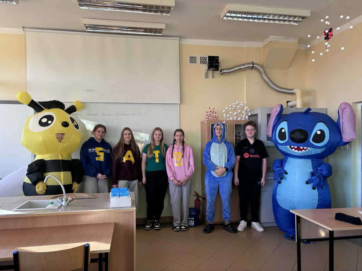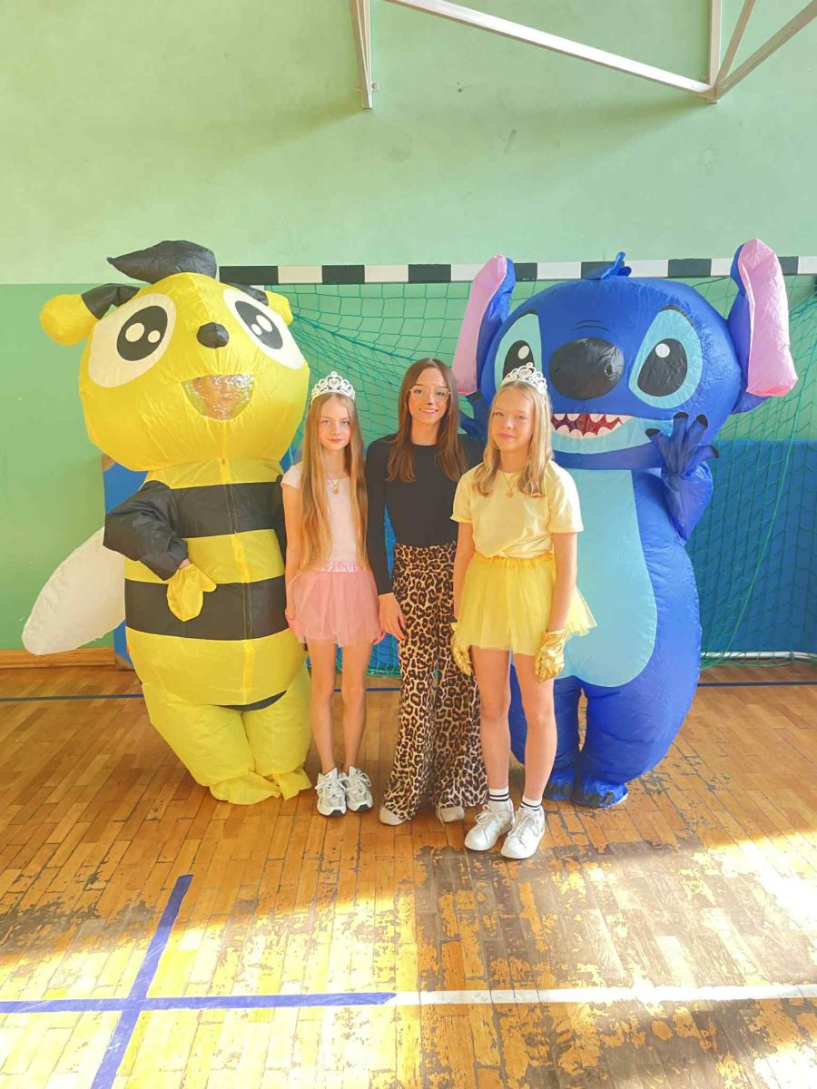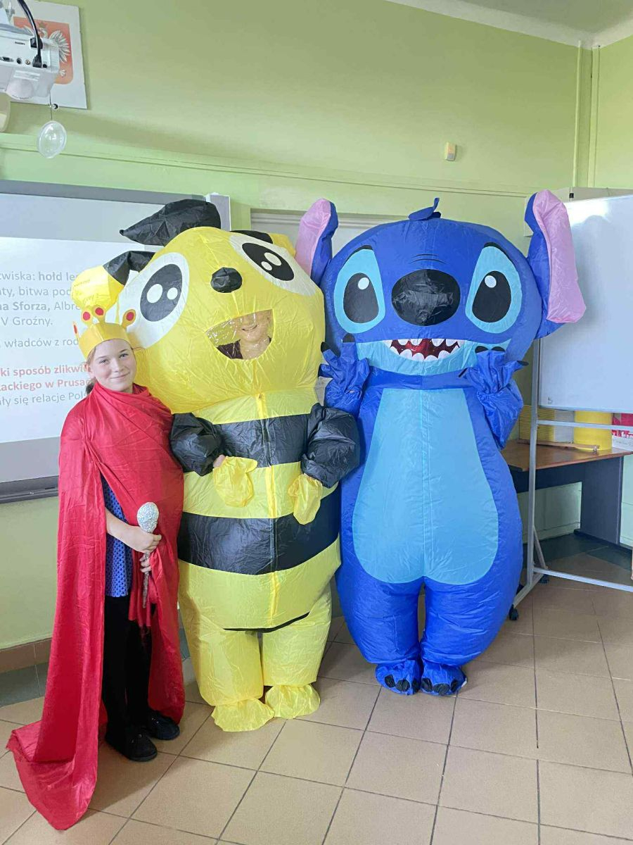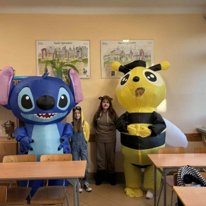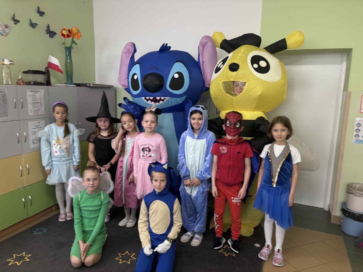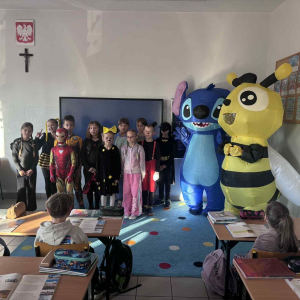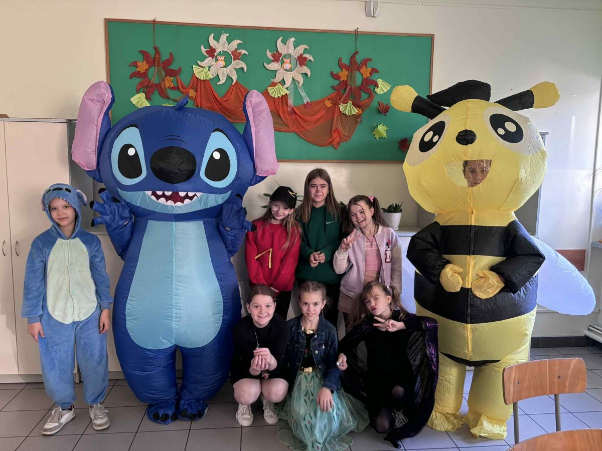 Niespodzianką były wizyty dwóch ogromnych, pompowanych postaci – Sticha i Pszczółki, które odwiedziły wszystkie klasy. Uczniowie chętnie robili sobie z nimi pamiątkowe zdjęcia, a ich obecność wywołała wiele śmiechu i radości.