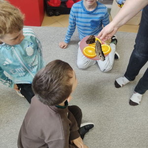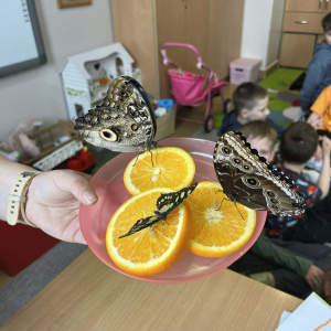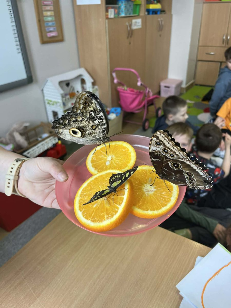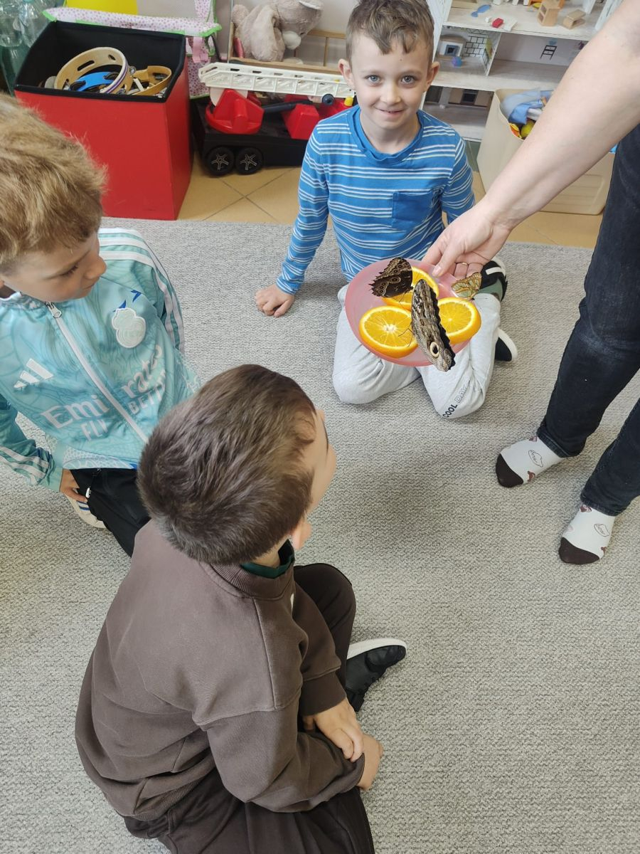 Podczas zajęć dzieci poznały cykl życia motyla, oglądały i dotykały kokony, a także miały okazję bezpośrednio obcować z żywymi, egzotycznymi motylami, które trzymały na dłoniach. Duże wrażenie zrobiły na nich barwne skrzydła owadów swobodnie latających po sali.