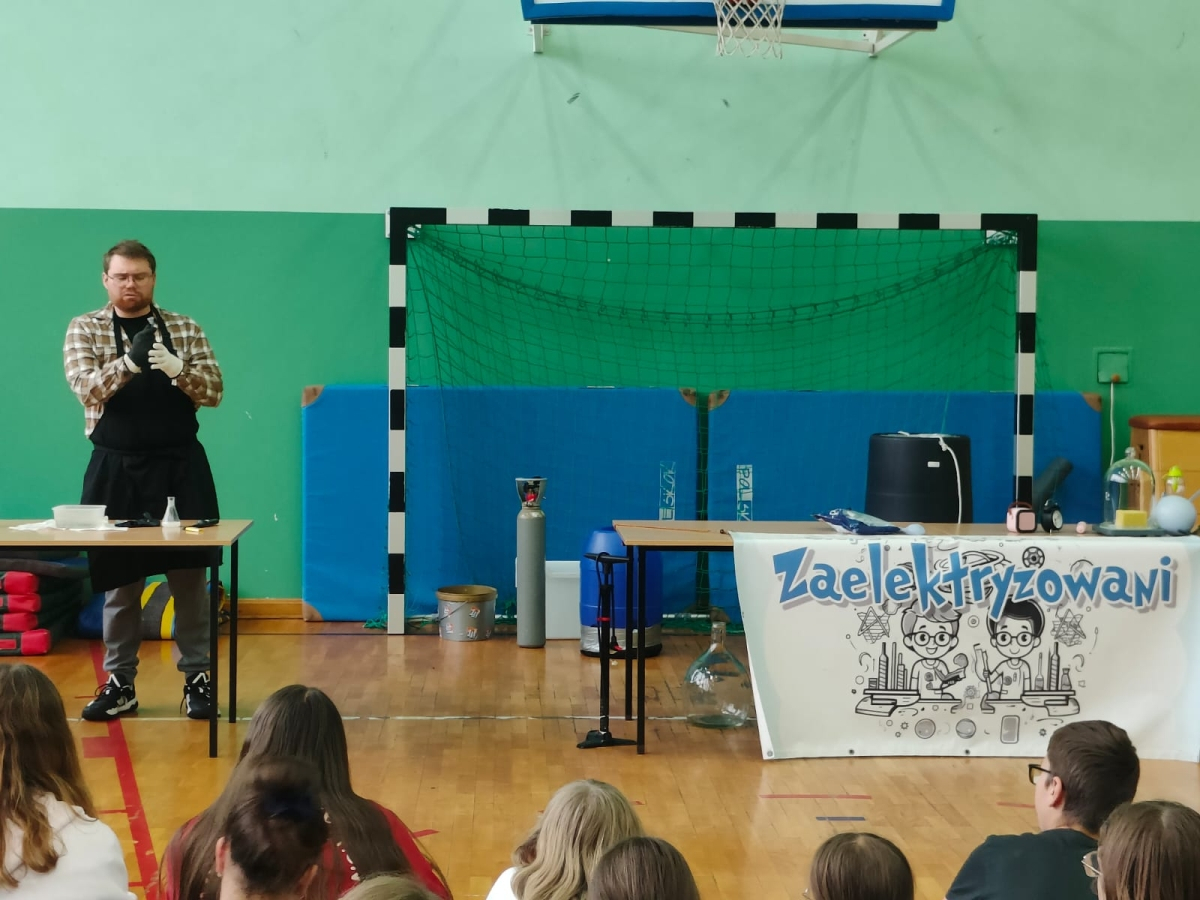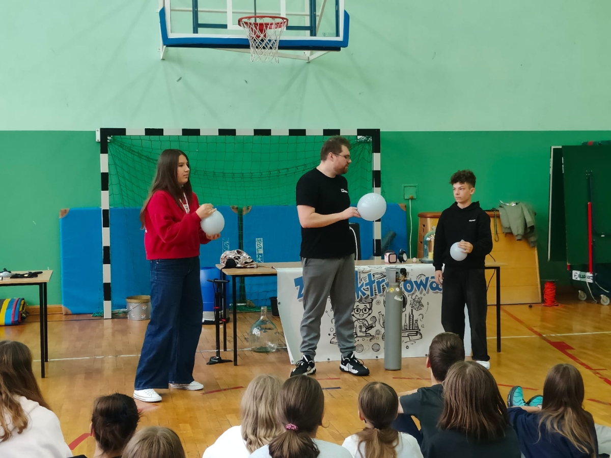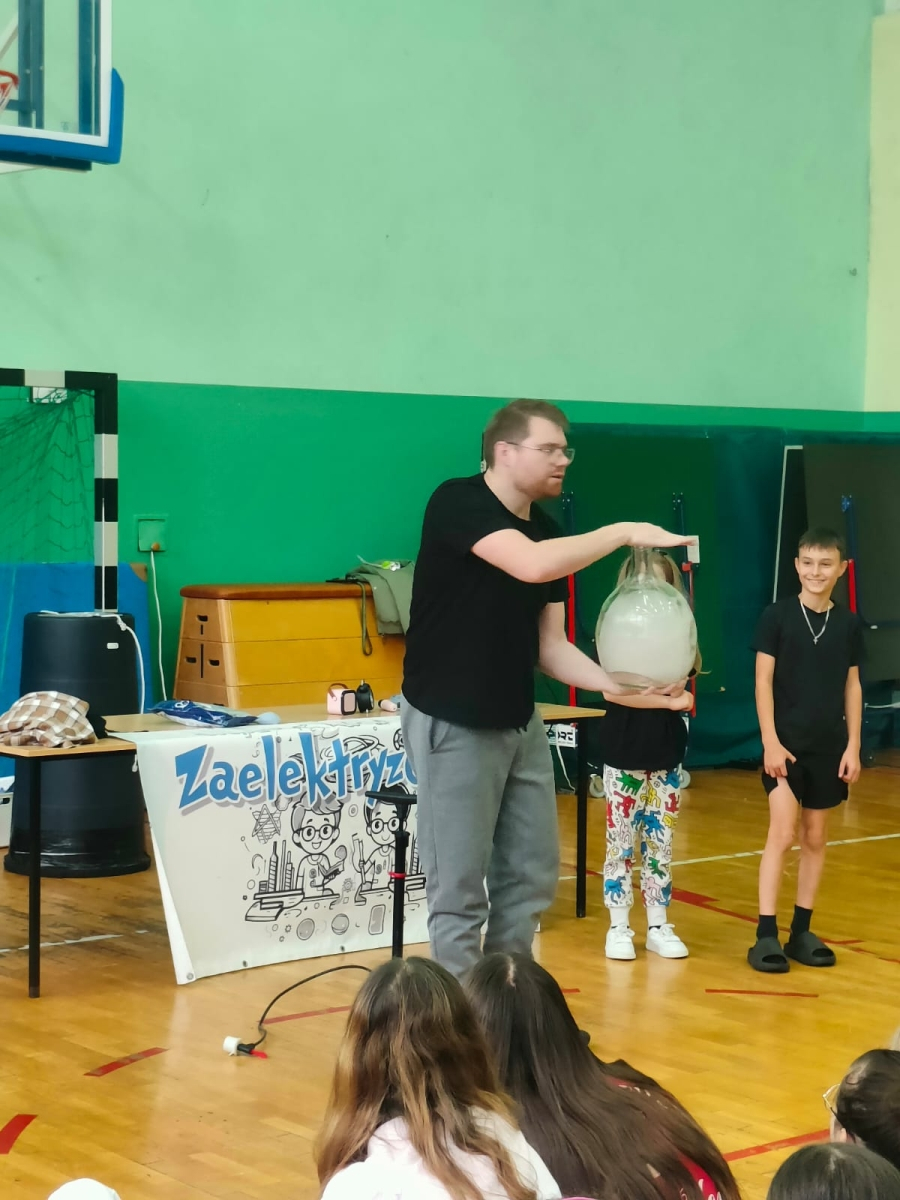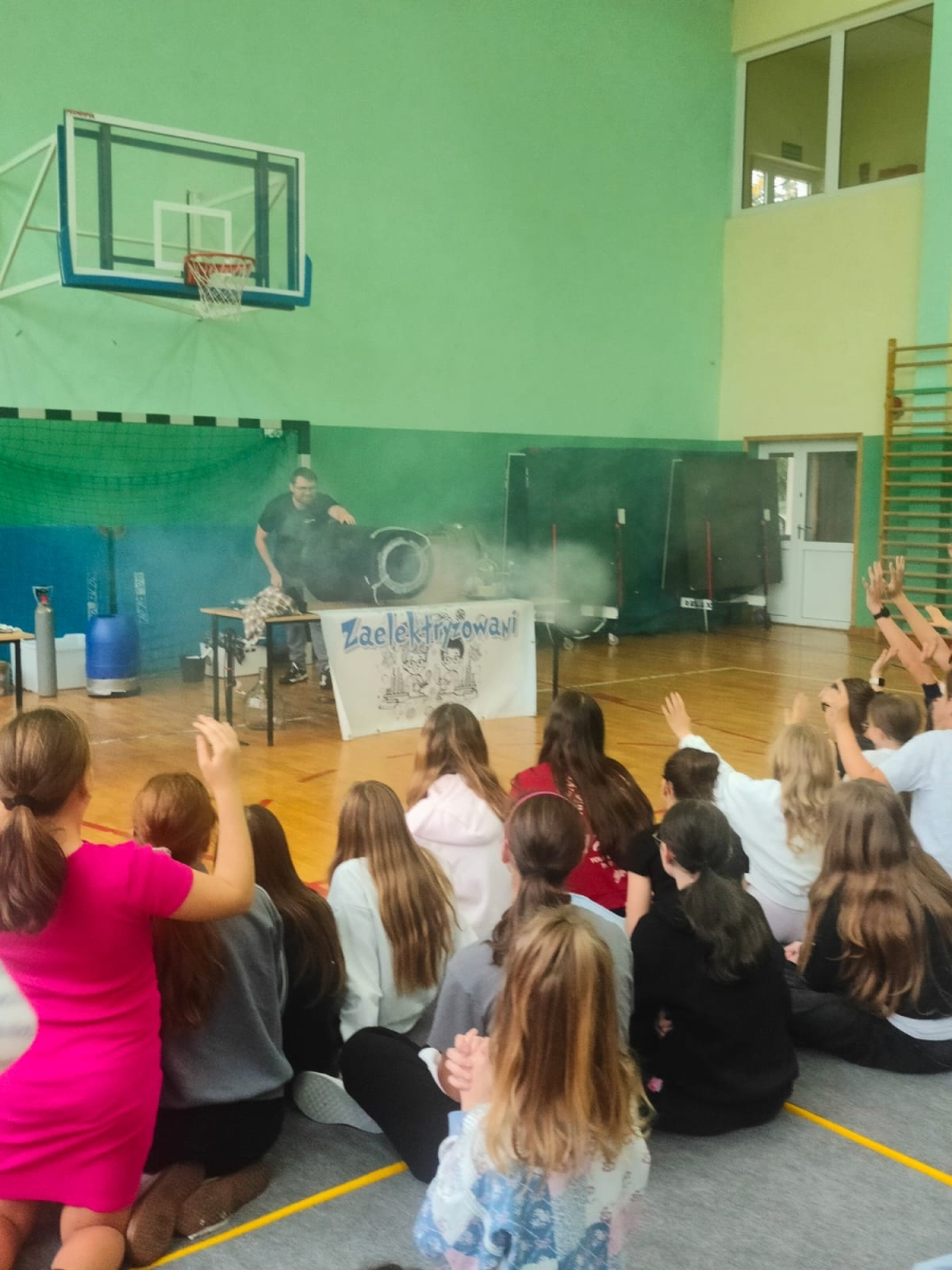 24 października naszą szkołę odwiedziła grupa Zelektryzowani z programem pt. „Fizyka wszędzie styka”. W pokazie wzięli udział uczniowie klas 1-3 oraz 4-8. Podczas spotkania uczniowie mieli okazję zobaczyć niecodzienne eksperymenty fizyczne, dowiedzieć się więcej o zagrożeniach i ochronie środowiska, a także uczestniczyć w zabawach z gazami - ciekłym azotem, helem i wybuchowym wodorem. Prezentowane były również ciekawe zjawiska fizyczne oraz kolekcja rekwizytów, w tym pompa próżniowa. Pokaz był pełen emocji. Dostarczył też solidną dawkę wiedzy w przystępnej i zabawnej formie. To była świetna lekcja która na długo zostanie w pamięci naszych uczniów.