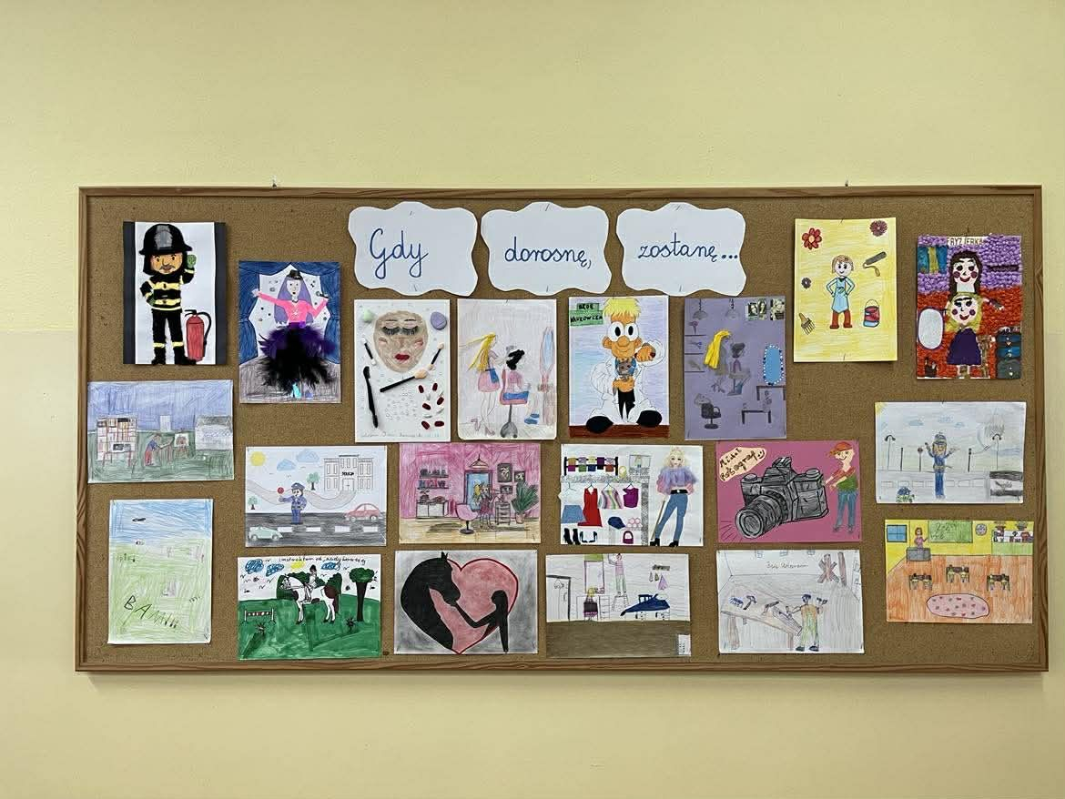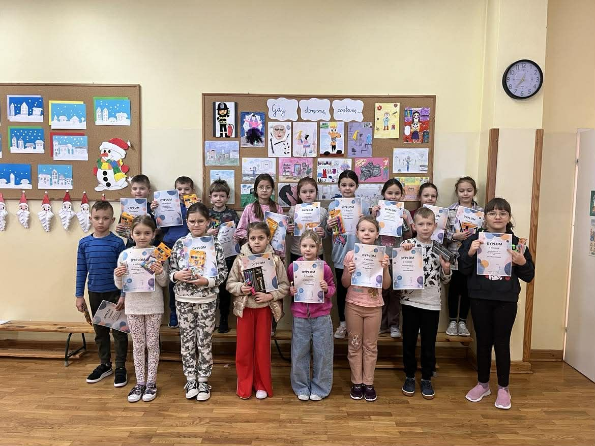 Konkurs plastyczny „Gdy dorosnę, zostanę…” skierowany do uczniów klas I-III miał na celu rozwijanie kreatywności, wyobraźni oraz zachęcanie dzieci do dzielenia się swoimi marzeniami dotyczącymi przyszłości. Na konkurs wpłynęło 20 prac, które zachwyciły różnorodnością tematów, pomysłów oraz zastosowanych technik plastycznych. Każda z nich przedstawiała indywidualną wizję przyszłego zawodu, marzeń i pasji dzieci. Ze względu na wysoki poziom i różnorodność nadesłanych prac wszyscy uczestnicy zostali nagrodzeni, otrzymując dyplomy oraz niespodzianki.