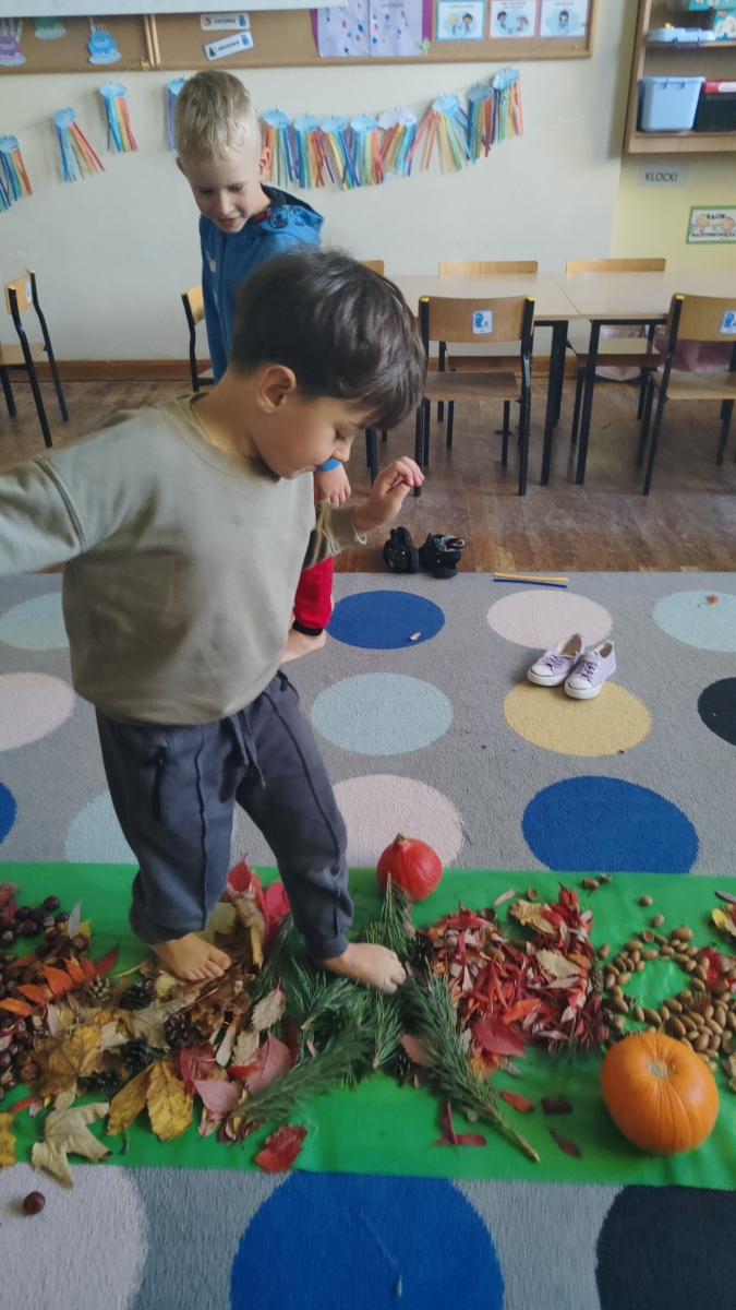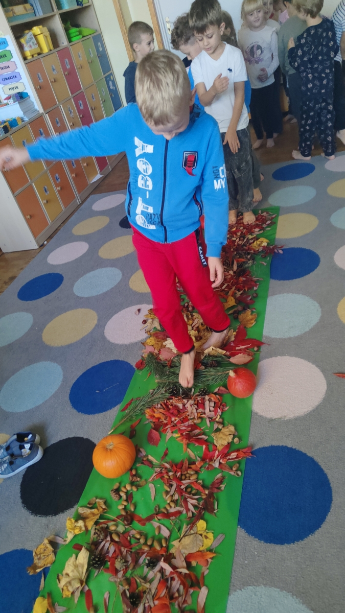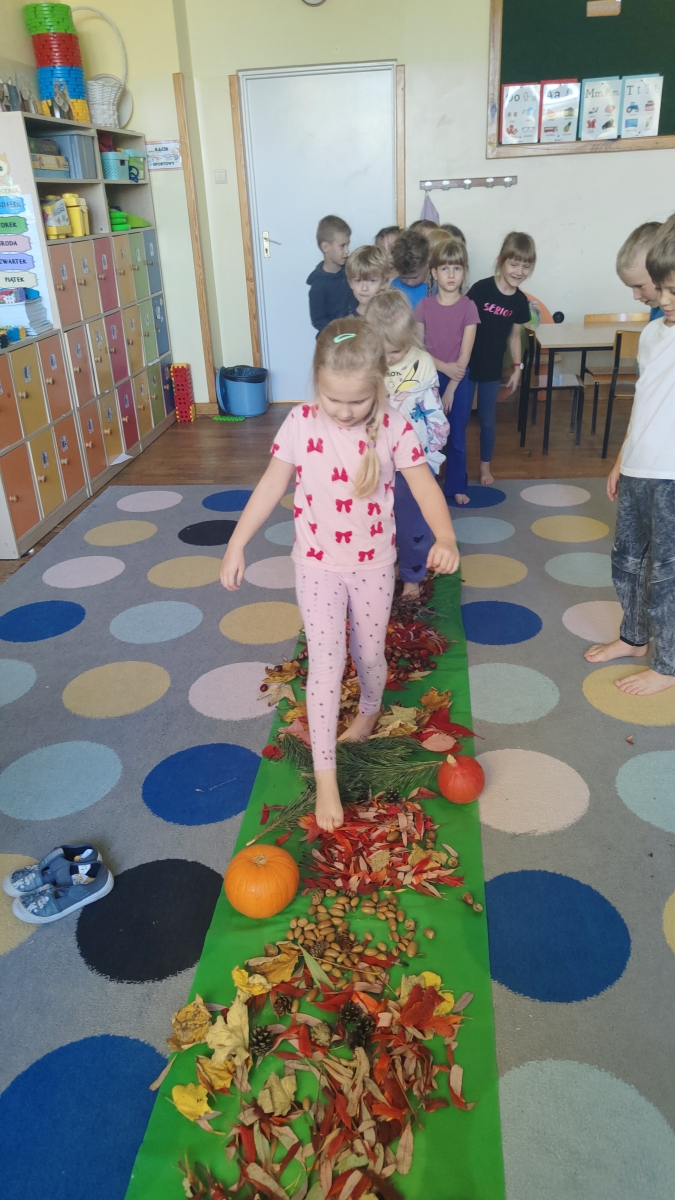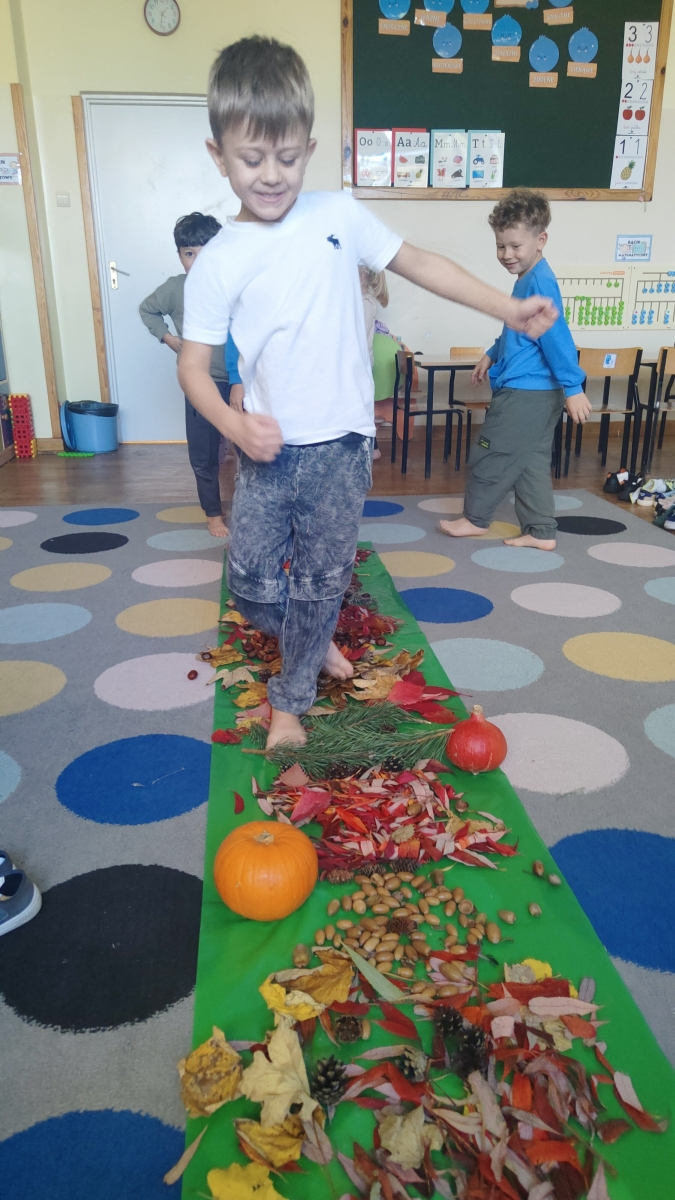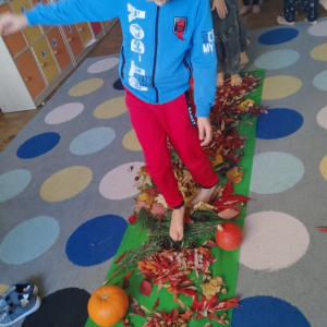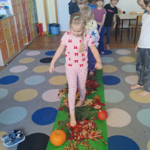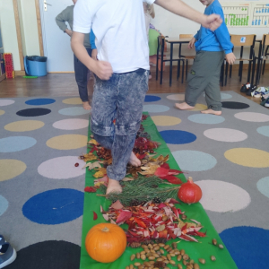 Dzieci z zerówki miały możliwość pospacerować po wyznaczonej trasie. Zgromadzone dary jesieni zostały wykorzystane do zrobienia ścieżki sensorycznej. Taka ścieżka ma bardzo duże znaczenie dla rozwoju dziecka- usprawnia motorykę dużą, rozwija wrażenia dotykowe, poprawia równowagę i koordynację ruchową oraz przede wszystkim stymuluje receptory. Ścieżka sensoryczna pozwala rozwijać wyobraźnie dotykową, która jest niezbędna do prawidłowego poznania świata przez dziecko. Spacer sprawił dzieciom mnóstwo frajdy i radości.