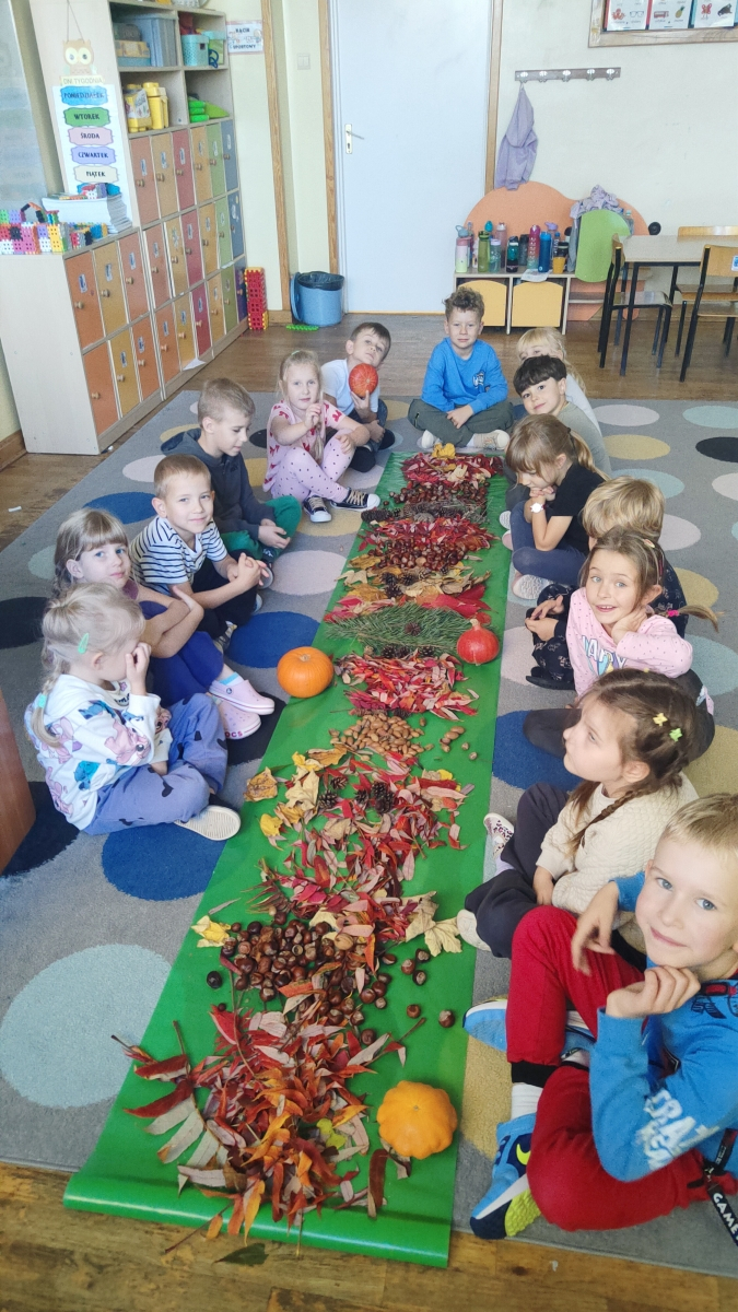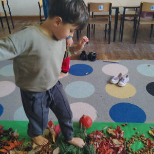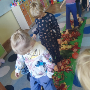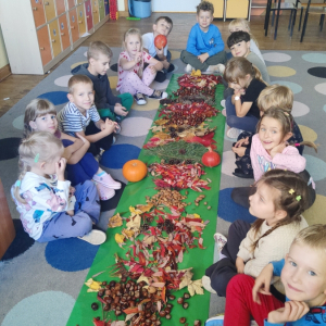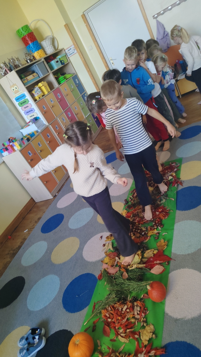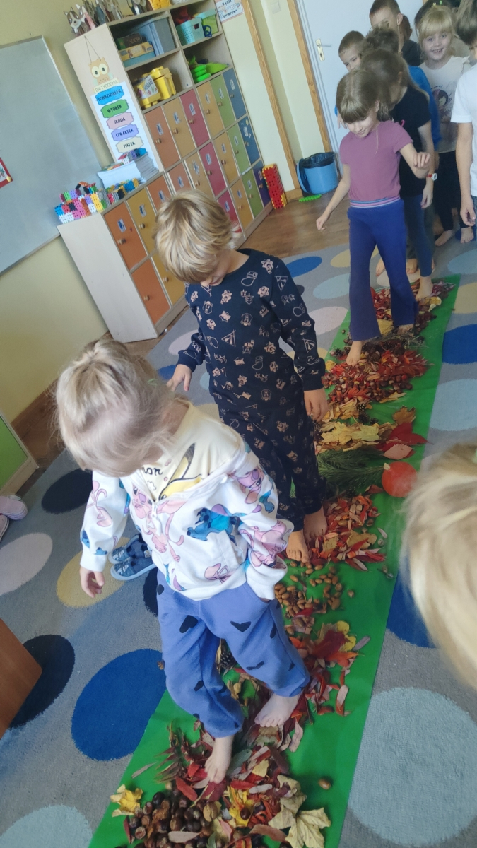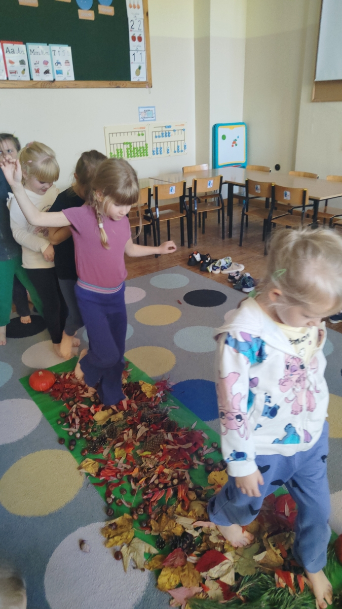 Dzieci z zerówki miały możliwość pospacerować po wyznaczonej trasie. Zgromadzone dary jesieni zostały wykorzystane do zrobienia ścieżki sensorycznej. Taka ścieżka ma bardzo duże znaczenie dla rozwoju dziecka- usprawnia motorykę dużą, rozwija wrażenia dotykowe, poprawia równowagę i koordynację ruchową oraz przede wszystkim stymuluje receptory. Ścieżka sensoryczna pozwala rozwijać wyobraźnie dotykową, która jest niezbędna do prawidłowego poznania świata przez dziecko. Spacer sprawił dzieciom mnóstwo frajdy i radości.