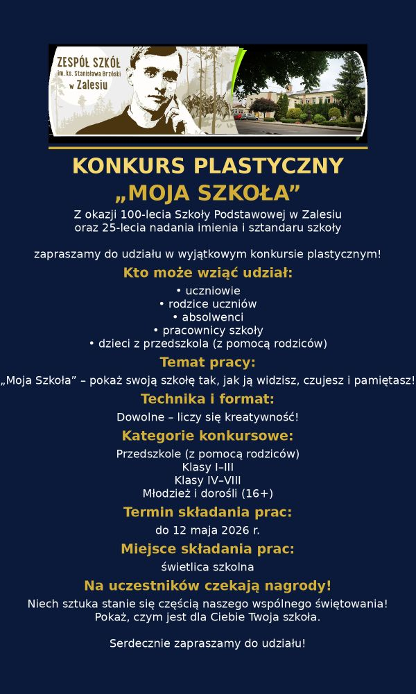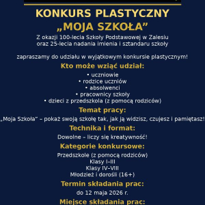 Z radością informujemy, że z okazji 100-lecia Szkoły Podstawowej w Zalesiu oraz 25-lecia nadania imienia i sztandaru szkoły organizujemy konkurs plastyczny pt. „Moja Szkoła”.