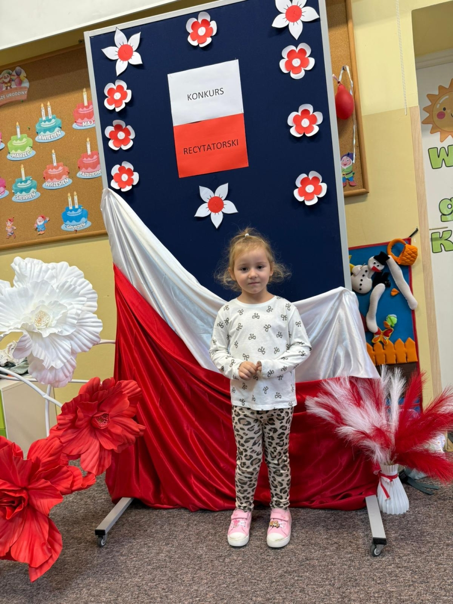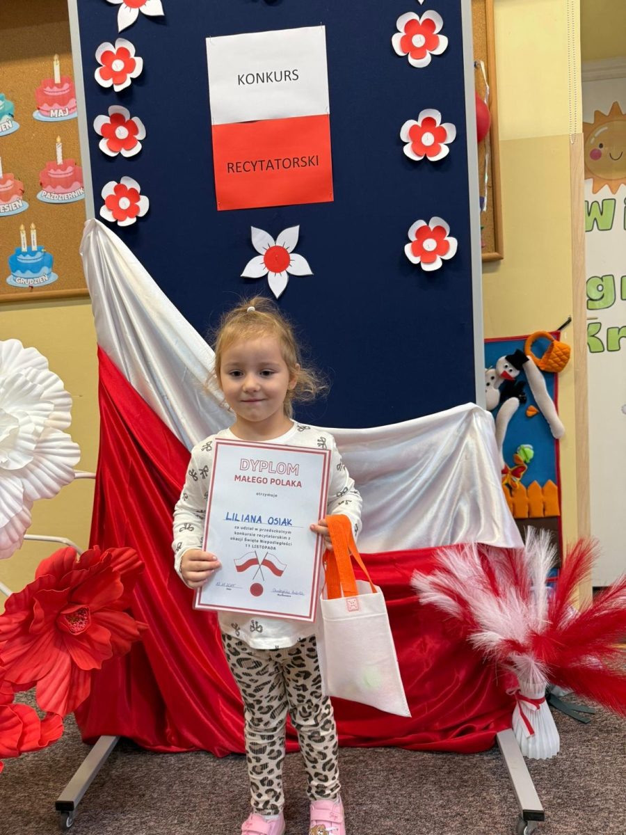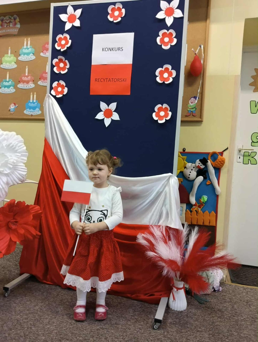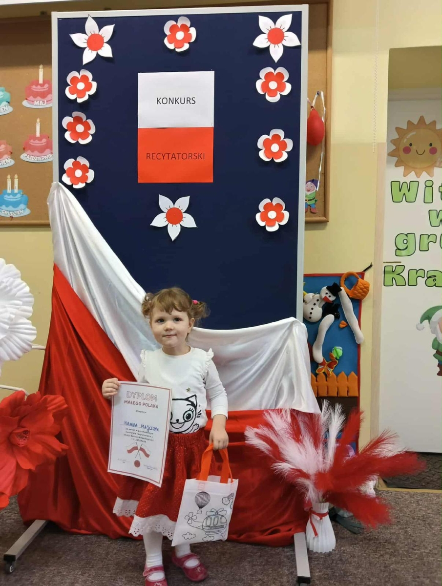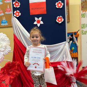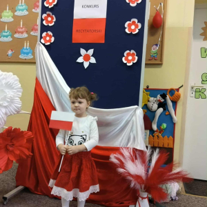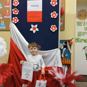 Z okazji Święta Niepodległości w naszym przedszkolu odbył się konkurs recytatorski. Wystąpiły w nim także dwie dziewczynki z najmłodszych grup, które z wielkim zaangażowaniem zaprezentowały wiersze o tematyce patriotycznej. Za swój piękny występ otrzymały dyplomy i drobne upominki. Gratulujemy naszym małym recytatorkom!