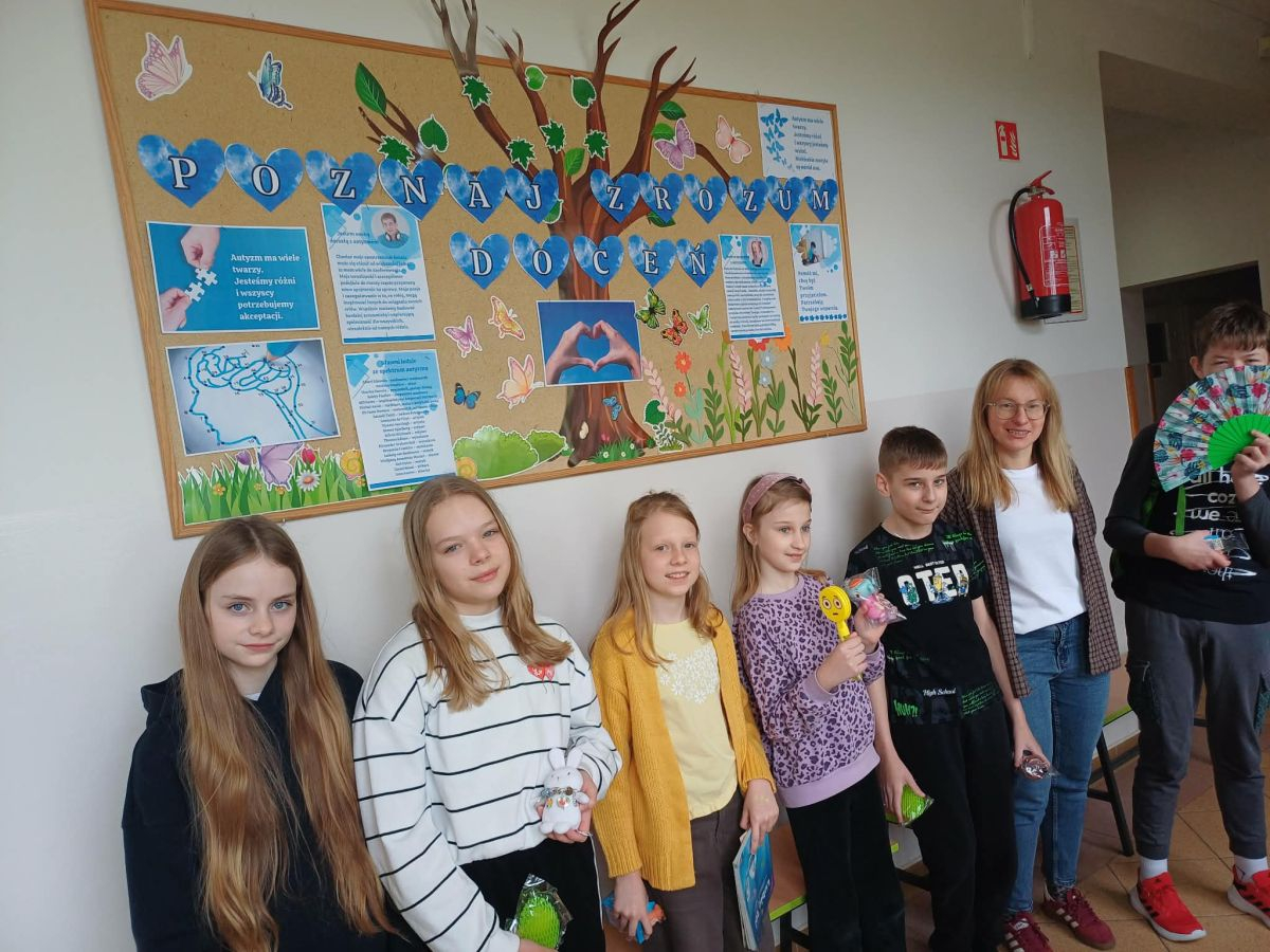 Autyzm to różnorodność sposobów postrzegania świata, komunikowania się i odczuwania emocji. Każda osoba w spektrum jest inna i posiada swoje unikalne mocne strony oraz wyzwania. W naszej społeczności szkolnej chcemy wspierać wzajemny szacunek, empatię i integrację. Dlatego w szkole został zorganizowany konkurs na „Hasło wspierające osoby w spektrum autyzmu”. Nagrody w konkursie zostały ufundowane przez Samorząd Uczniowski. Wybrani chętni uczniowie zaangażowali się w przygotowanie dwóch „cichych przerw” na znak solidarności z osobami w spektrum.