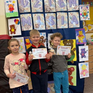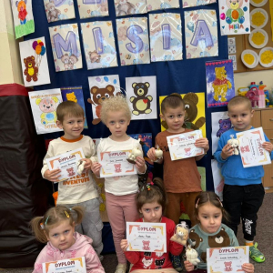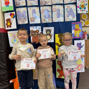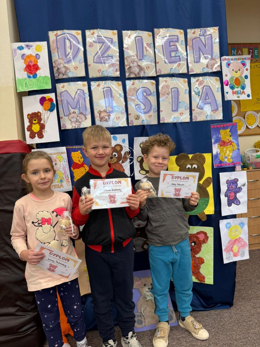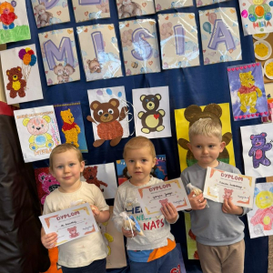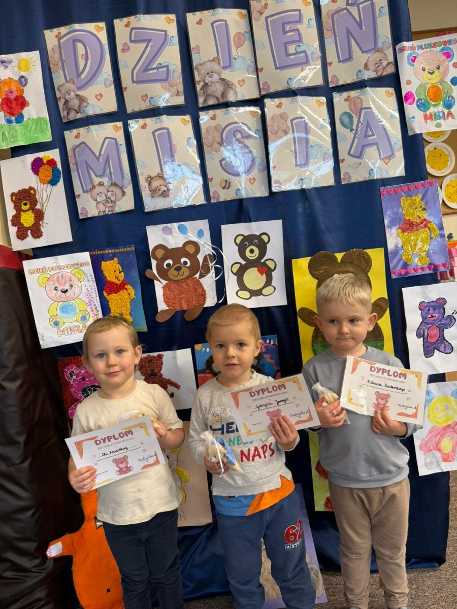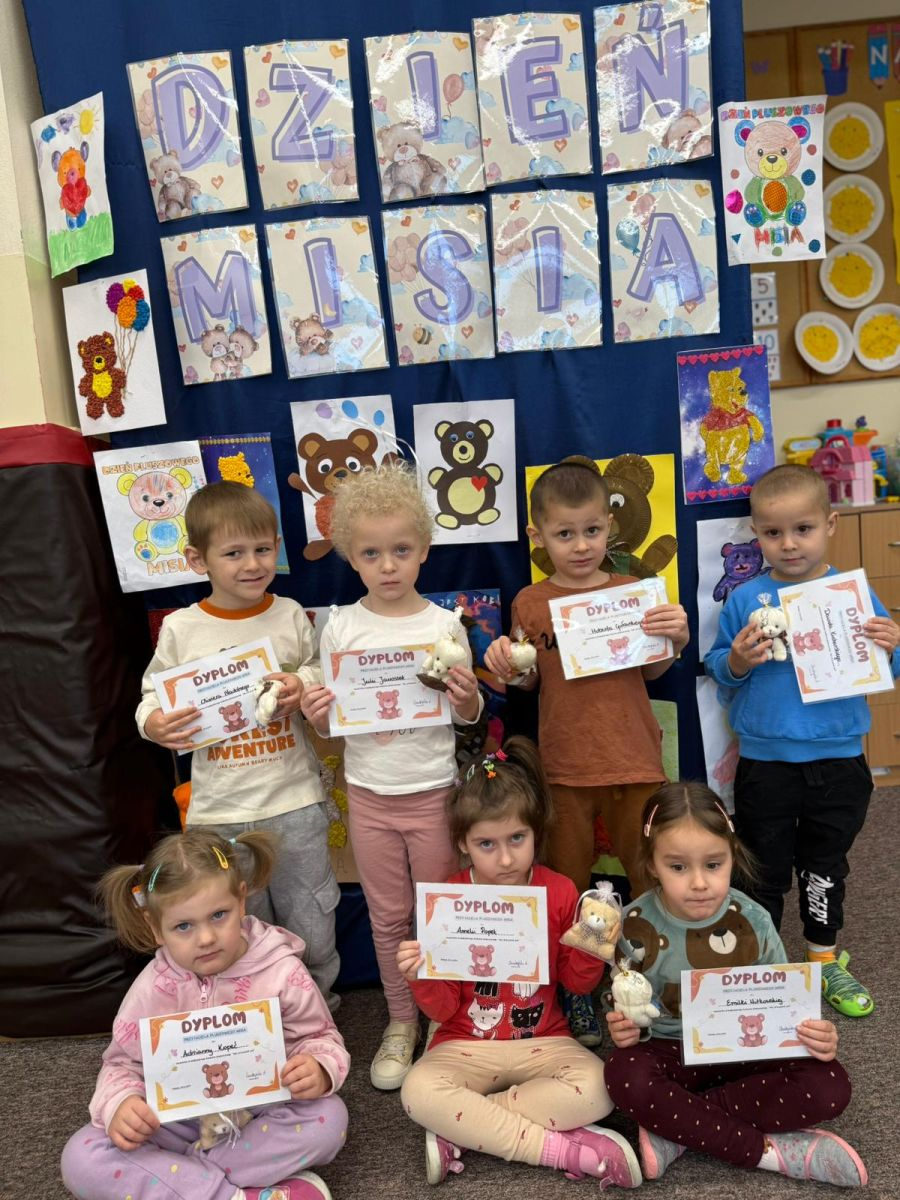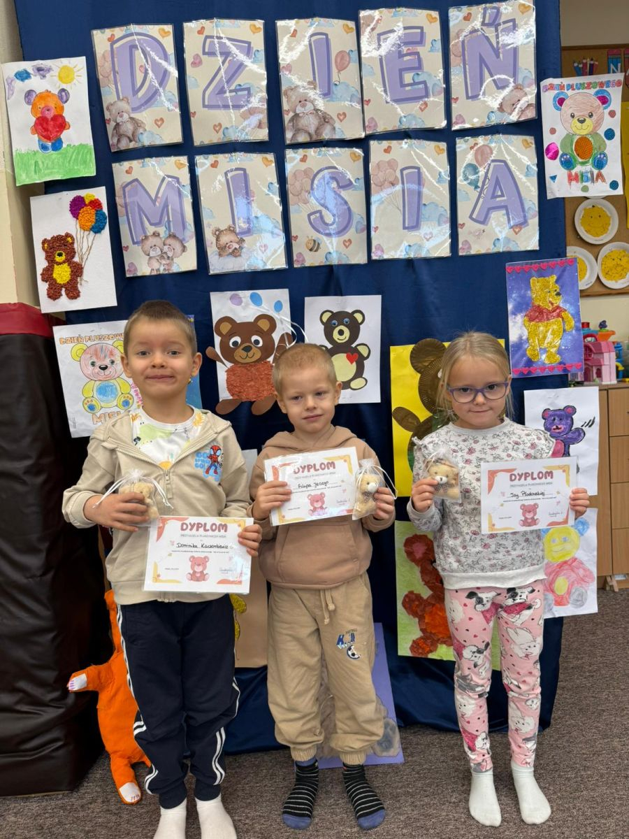 W przedszkolu odbył się konkurs plastyczny „Mój ulubiony miś” dla dzieci w wieku 3–6 lat. Przedszkolaki przygotowały kolorowe, pomysłowe prace przedstawiające różne misie, wykazując się wyobraźnią i kreatywnością. Każdy uczestnik otrzymał dyplom oraz drobny upominek jako wyróżnienie za udział i zaangażowanie. Konkurs dostarczył dzieciom dużo radości i był okazją do rozwijania ich talentów plastycznych.