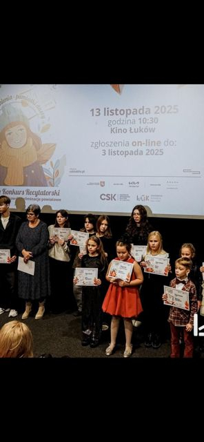 13 listopada w Łukowskim Ośrodku Kultury odbył się turniej powiatowy 29. Jesiennego Konkursu Recytatorskiego pod hasłem „Wspomnienia – pamiątki duszy”. Naszą szkołę reprezentowało troje uczniów. Byli to: Natalia Wasak kl. V, Julia Augustyniak kl. IV b oraz Nikodem Augustyniak kl. I b. Wszyscy zaprezentowali wysoki poziom interpretacji i kultury słowa, a ich występy zostały bardzo dobrze przyjęte przez jury. Dodatkowo przekaz stał się źródłem refleksji nad życiem, emocjami i wspomnieniami, które wciąż żyją w nas – jako cenne pamiątki duszy.
